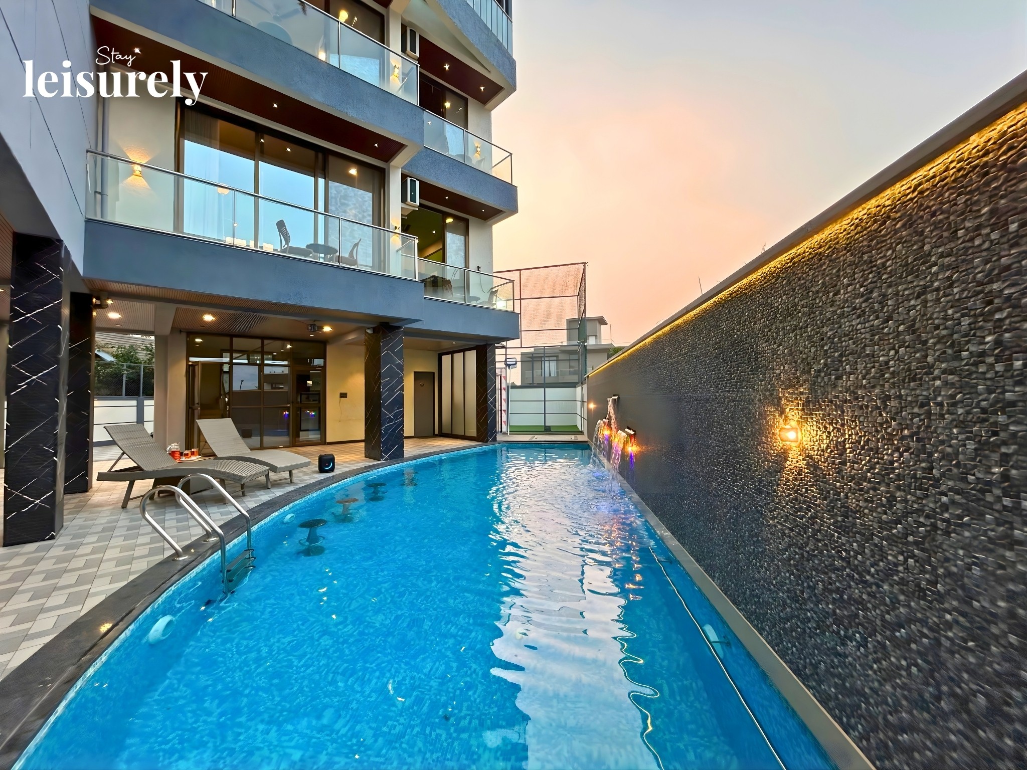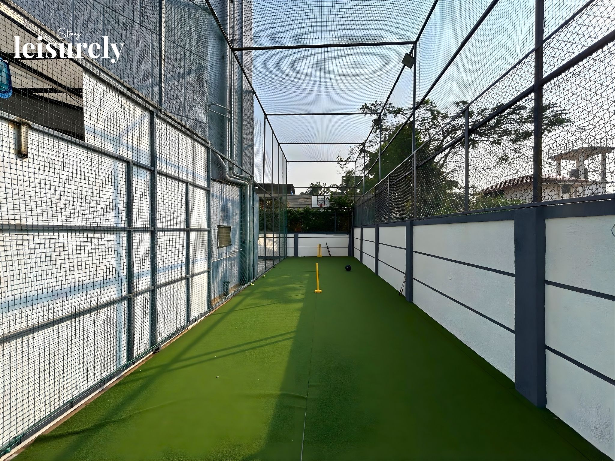 The ground floor features a game area with table tennis, foosball, and carrom, along with a private swimming pool (30×18 ft, 4.5 ft depth) with 2 sun loungers for sunbathing or relaxing. Adjacent to the pool, a common washroom is available for convenience. Guests can also enjoy the private sports turf, perfect for cricket, badminton, or basketball.