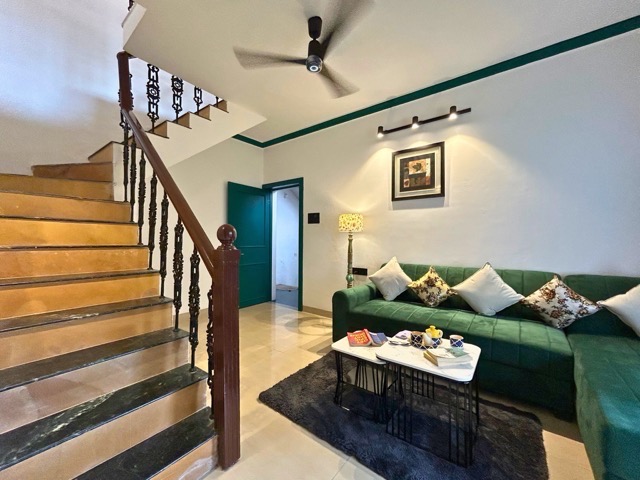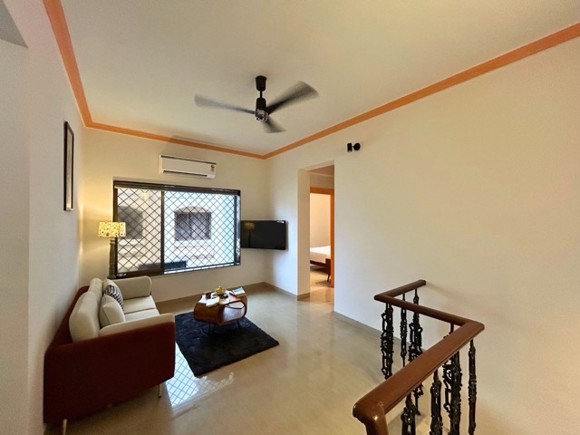 - A secondary small living area is located on the first floor, featuring a 3-seater sofa and serving as a common space for the two upper bedrooms.